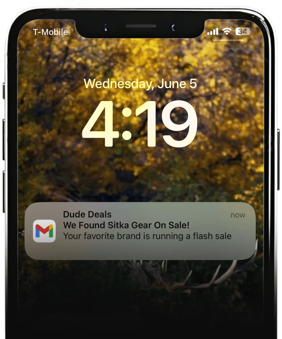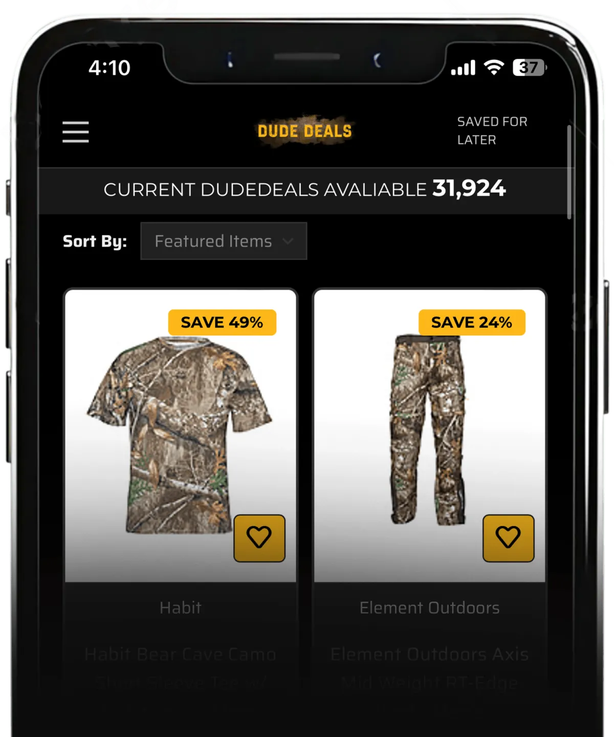 Dude Deals finds deals in tons of different categories, here are a few: Hunting Gear & Camo, Guns & Ammo, Fishing Gear, Men's Clothing, Men's Footwear, Men's Accessories, Camping & Hiking Gear, and much...much...more!